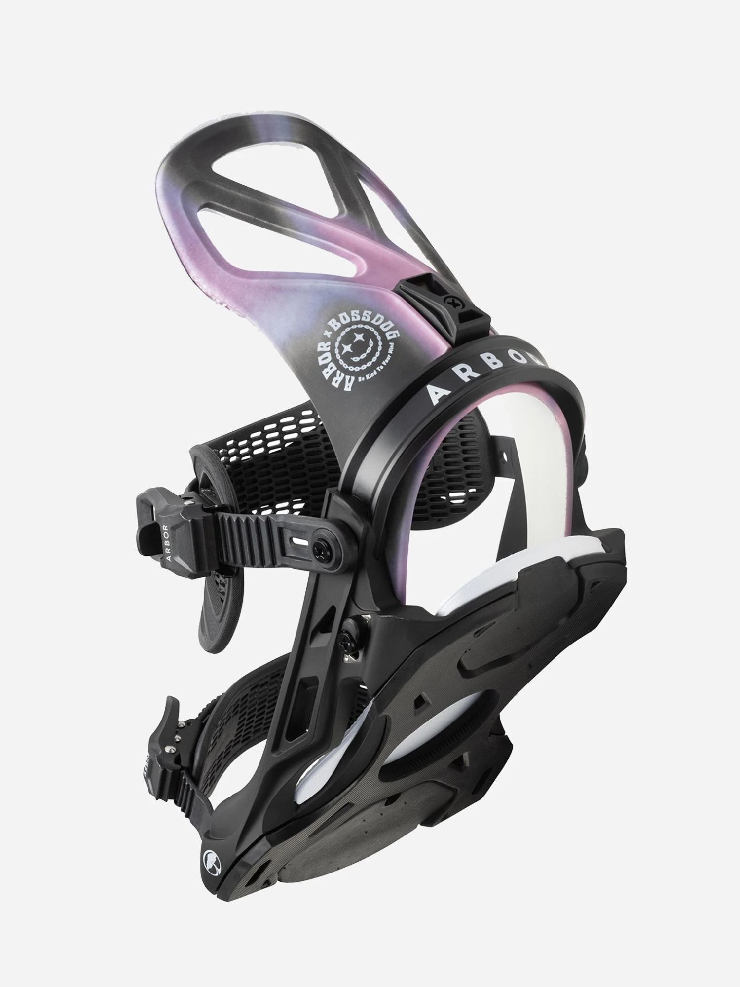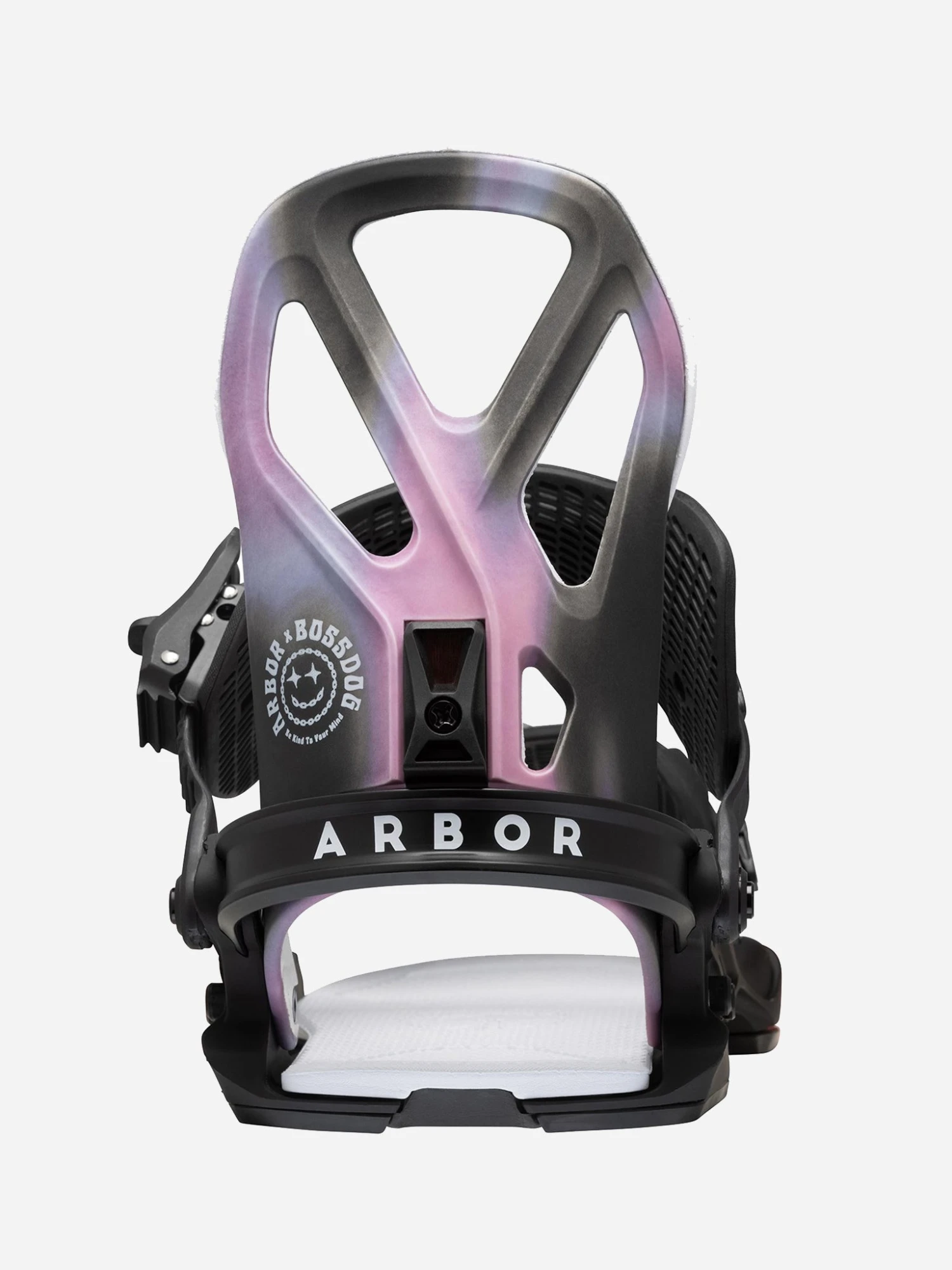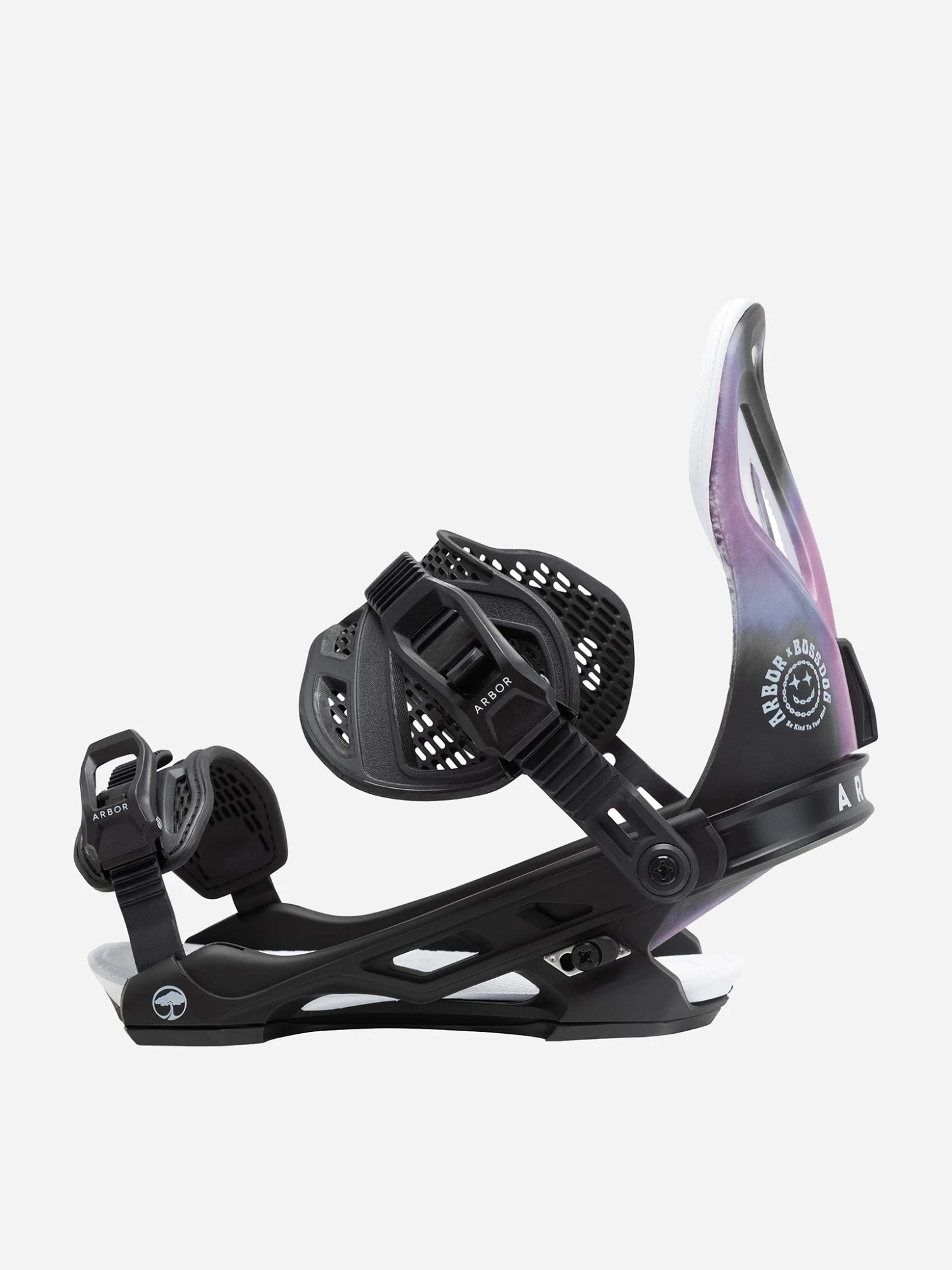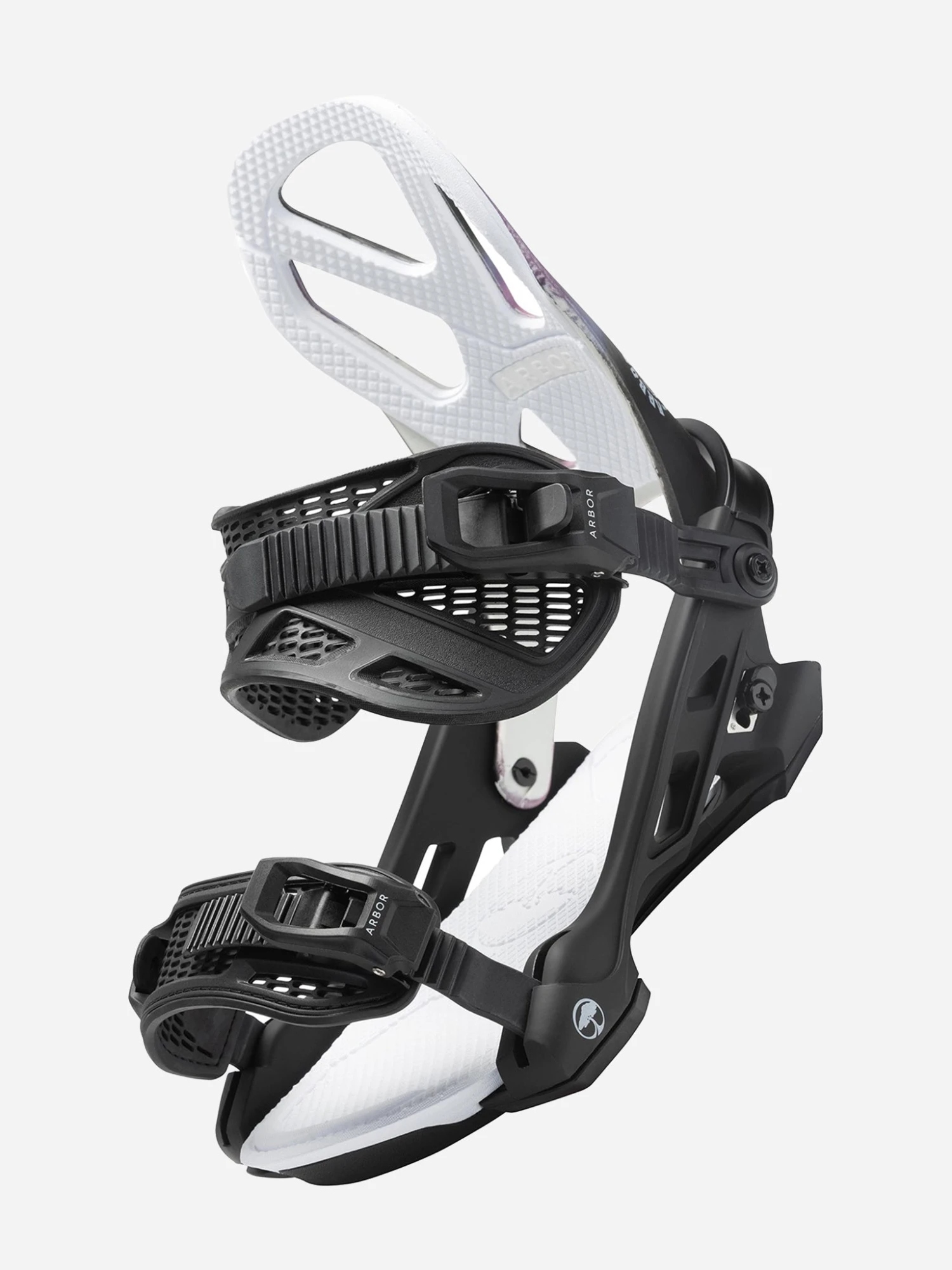 FEATURES:Snowboard BindingsBaseplate: System X – The System X design evenly distributes a rider’s energy into their snowboard. No matter where pressure is applied to the binding, the System X allocates energy across the baseplate’s structural X shape, and out to the four cardinal points. The result is quicker, more effective control. 15% glass content for added strength and stability50A Durometer Outsole – The Outsole is a dampening interface made from a special TPE rubber. The Outsole integrates with the System X design and sits between the binding and a rider’s snowboard. The Outsole diffuses high-frequency chatter while providing rebound and cushion for high-impact landings. On the Cypress, Arbor uses a slightly stiffer durometer TPE for added performanceAdjustable Extruded Aluminum Heelcup – Highly durable extruded aluminum, designed to work with the Mini-Disk for amazing adjustabilityEVA FootbedHighback: Asymmetrical Highbacks – Arbor bindings feature low mounted asymmetrical highbacks with 5° pre-rotation, providing ergonomic feel and freedom of movementTool-less Forward Lean AdjustmentStraps: Bow-Strap Adjuster – Arbor’s patented “Bow-Strap” adjuster and ladder strap swings out of the way quickly and easily, making binding entry a simple, user-friendly experience. The pre-curved strap steers clear of your boot while maintaining form and durability in even the coldest conditionsCo-Moulded Ankle StrapBuckles: Fiberglass Reinforced Nylon Buckles and LeversAdditional Features: 2×4 Universal Mini-Disc – Mini-Disks require less surface area and along with the System X help provide a more organic snowboard flex underfoot. They are channel compatibleAbility Level: Intermediate – AdvancedFlex Rating: MediumBinding Mount Pattern: 2×4