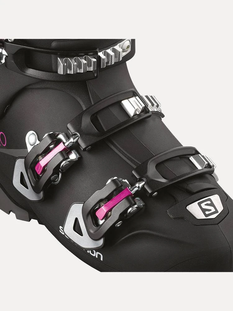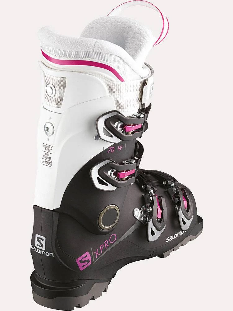 FEATURES:Last: 100 mm – An average last for most normal width and volume feet or slightly wider.Flex: 70 – Medium soft flex; perfect for less aggressive or lighter skiers.Women’s Liner – Specific volume and shape, with added warm comfy fur inside.My CustomFit 3D Sport Liner – Superior heel hold and new anti-packing foam.Women’s Calf Adjustment – The most efficient and convenient calf adjustment on the market. Only one screw turn enlarges the upper cuff up to 1cm to fit all legs shapes easily and quickly.TwinFrame Technology – Salomon dials in just the right amount of rigidity where it’s needed for performance and leaves the shell softer in other areas to enhance comfort and ease of entry.4 Micro-Adjusting Aluminum 3D Buckles35mm Velcro Power StrapHeel and Toe Removable Sole Pads – Heel and toe pads can be replaced when worn out.24mm Oversized Pivot – Reduced play for extreme precision and direct power transmission. Because many modern all mountain skis are wider, they require more torque to stay on edge. Oversized Pivot answers the need of wider skis.