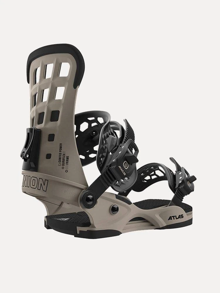 FEATURES:Stage III Duraflex ST Base: Responsive by design, once injected with Duraflex ST Nylon, the Stage 3 Atlas base becomes an even stiffer, all mountain ripping machine. Tried and true, this base has a huge fanbase.Multi-Density Thermoformed EVA Bushings – Multi-Density Thermoformed Bushings sustain their function season after season – unlike competitors who use urethane, rubber or other materials that change color and become brittle over time.Extruded 3D Aluminum Heelcups: The rigidity and strength of Extruded Aluminum acts like a roll cage on a race car – stiffening the entire chassis. The male/female connection with the base provides seamless response.Atlas Highbacks: Super lightweight, streamlined design provides a seamless boot interface with complete lateral freedom for maximum tweakage.Exoframe Ankle Straps: Strength and instant response on the outside, fit and comfort on the inside – the ExoFrame ankle strap provides the ultimate connection between rider and board.Ultragrip X Toe Straps – Multi-positional options and thermoplastic anti-slip material keeps you locked in and on point. Each version has differing amounts of material based on weight.Canted Power – Canted Power – Ideal for riders using a wide stance, Canted Gas Pedals supply extra leverage and ollie power. Canting also allows the ankle and knee joints to be aligned, alleviating pain.Quick Adjust Forward Lean – Easily adjust the forward lean on the binding to dial in a custom ride.Magnesium – Union’s proven bombproof ratchet system, Magnesium buckles are light, sleek, and durable on the mountain.Universal Disk – Compatible with 4×4, 4×2, and The Channel.